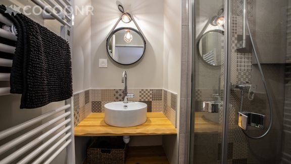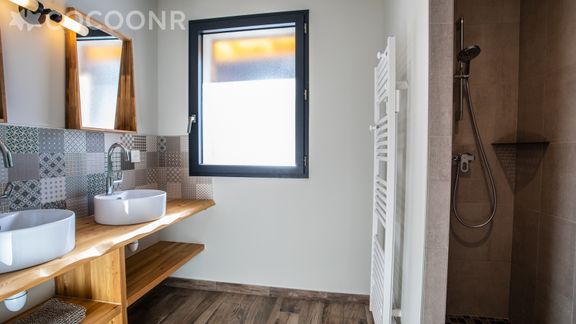 - Chambre 1 : Lit double (140x200), rangements et salle d'eau privative avec vasque, douche à l'italienne, étendoir.