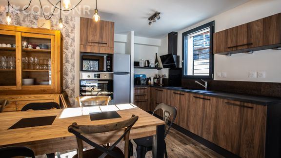 - Une cuisine ouverte sur le salon et entièrement équipée : réfrigérateur, lave-vaisselle, plaques à induction, micro-ondes, grille-pain, bouilloire, service à raclettes, cafetière à filtre et à dosette Nespresso...