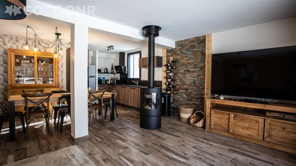 - Un salon avec un canapé, table basse, une grande TV, poêle à bois (non utilisable).