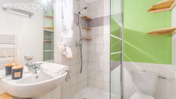 - Une salle d'eau avec une douche, un lavabo, un sèche-serviette, un sèche-cheveux et un WC.