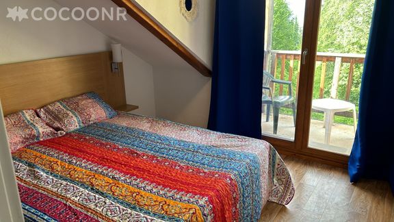 🙁 Le descriptif de l'appartement n'est pas tout à fait exact, il y a 3 chambres : 2 à l'étage avec 1 lit double dans chacune, en haut de l'escalier il y a 2 lits superposés (coin montagne non fermé) et 1 plus petite chambre au rez de chaussée adjacente à la pièce de vie comportant 2 lits superposés.