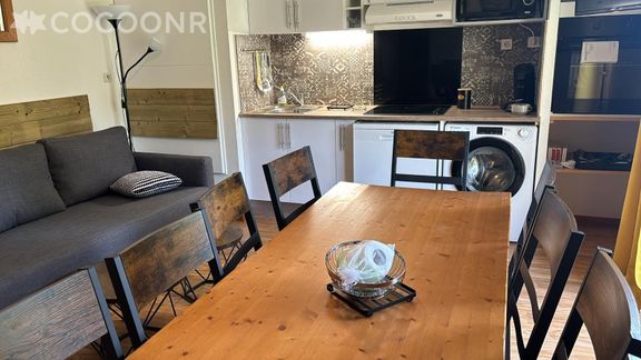 - Une kitchenette, ouverte sur le salon et entièrement équipée : réfrigérateur, lave-vaisselle, plaques à induction en vitrocéramique, four, micro-ondes, grille-pain, bouilloire, service à raclettes, cafetière à filtre et senseo...