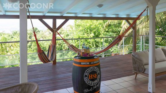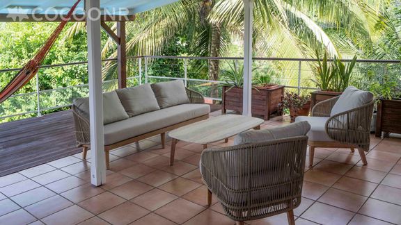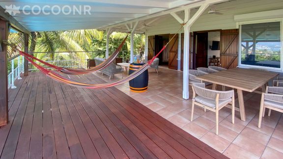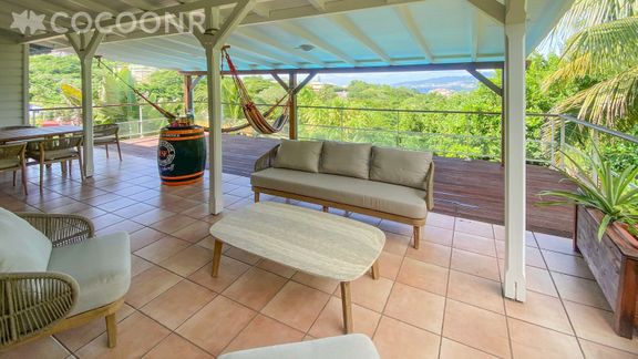 - La terrasse à l'étage fait 58,5 m² et dispose d'une table, d'un salon de jardin (canapés et fauteuils), ainsi que de deux hamacs