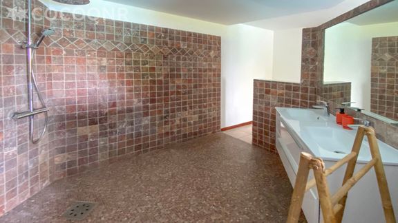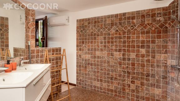 - La terrasse autour de la piscine fait 40 m² et dispose de six transats et d’une douche extérieure avec eau à température ambiante