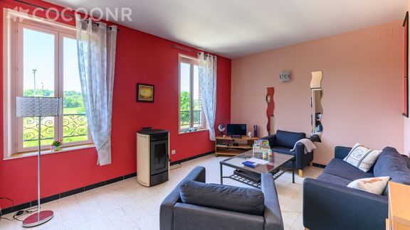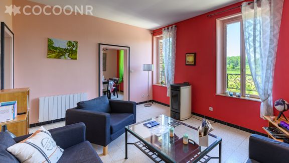 - Une pièce de vie de 18 m² avec TV, canapés, poêle à granulé...