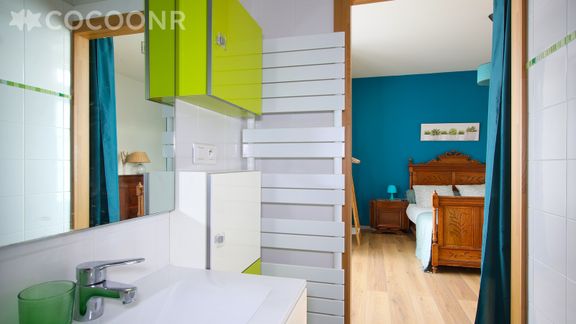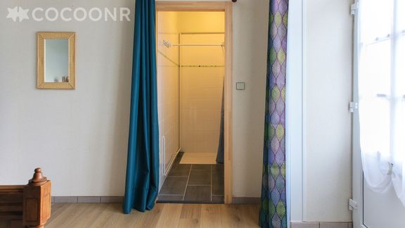 - Une salle d'eau avec douche et chauffe-serviettes