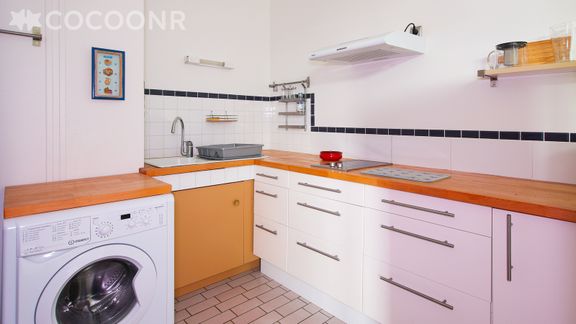 - Une cuisine ouverte équipée avec notamment : bouilloire électrique, four à micro-ondes, grille-pain, hotte, plaques de cuisson, appareil à raclette, lave-linge, etc.