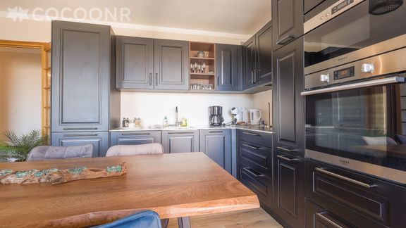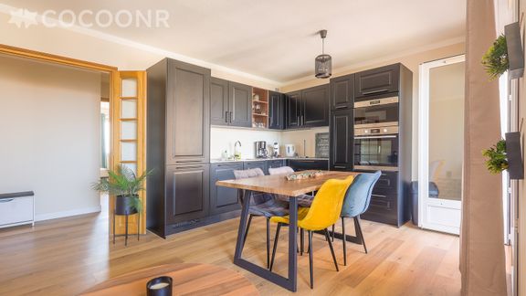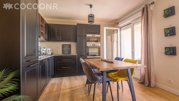 - Une cuisine équipée donnant sur un balcon avec notamment : bouilloire électrique, four, four à micro-ondes, grille-pain, lave-vaisselle, plaques de cuisson...