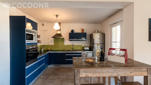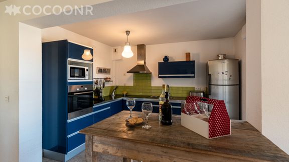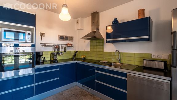 - Une cuisine ouverte équipée avec notamment : bouilloire électrique, four, four à micro-ondes, grille-pain, lave-vaisselle, plaques de cuisson, cafetière à dosettes Nespresso...