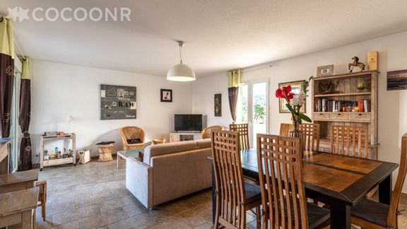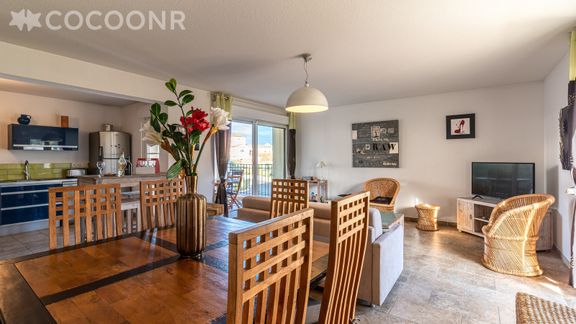 - Une pièce de vie de 44 m² avec TV, canapé, fauteuils et espace repas.