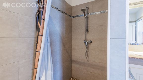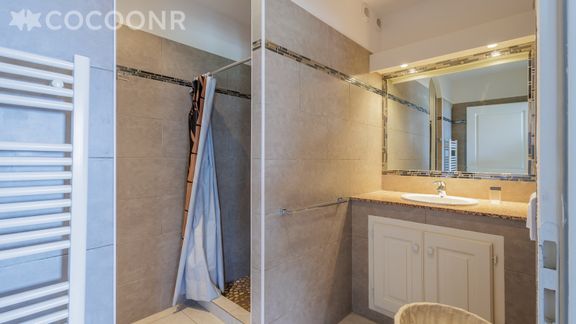 - Une salle d'eau avec douche italienne, meuble vasque, sèche-serviette