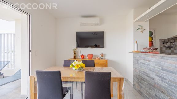 - Une pièce de vie de 25 m² avec TV, canapé-lit (140X190) et un espace salle à manger pour se réunir autour d'un bon repas