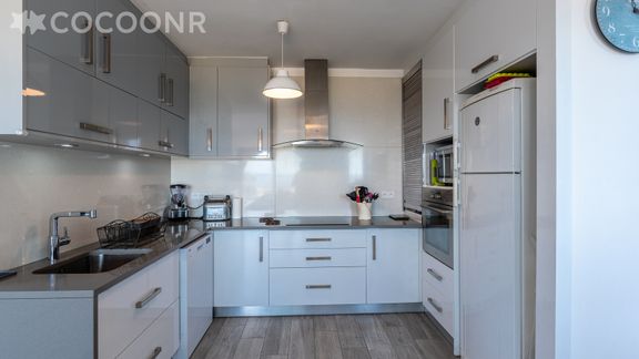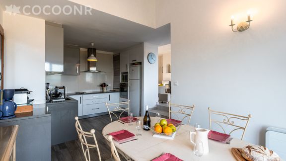 - Une cuisine ouverte sur un coin repas et équipée avec notamment : bouilloire électrique, four, four à micro-ondes, grille-pain, lave-vaisselle, plaques de cuisson, cafetière à dosettes Nespresso...