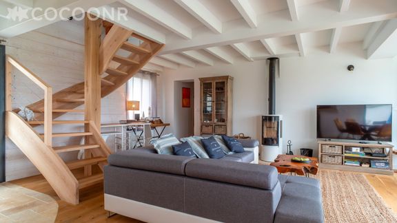 - Une pièce de vie de 150 m² avec TV, canapé, coin repas, cheminée (bois non fourni)