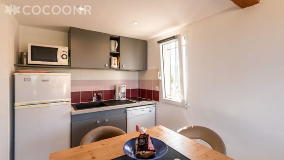 - Une cuisine ouverte équipée avec notamment : bouilloire électrique, four à micro-ondes, grille-pain, lave-vaisselle, plaques de cuisson...