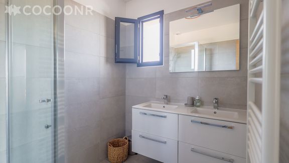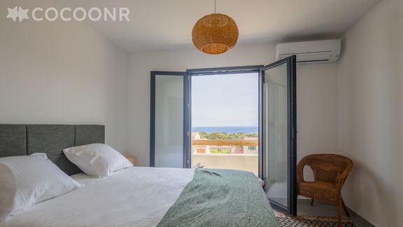 - Chambre 1 (suite parentale avec vue mer) : un lit queen-size (160×200) et une salle d'eau attenante avec douche à l'italienne.