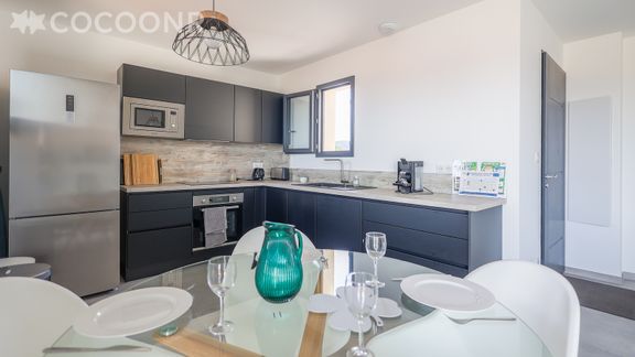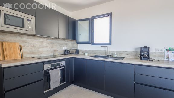 - Une cuisine ouverte équipée avec notamment : bouilloire électrique, four, four à micro-ondes, grille-pain, lave-vaisselle, plaques de cuisson...
