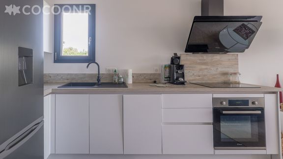 - Une cuisine ouverte équipée avec notamment : bouilloire électrique, four, four à micro-ondes, grille-pain, lave-vaisselle, plaques de cuisson...