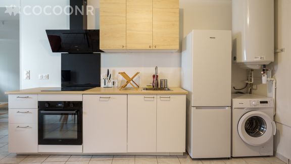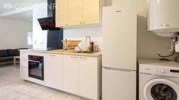 - Une cuisine ouverte équipée avec notamment : bouilloire électrique, four, grille-pain, lave-vaisselle, plaques de cuisson...