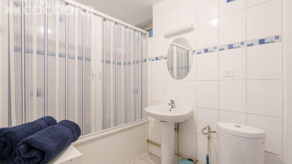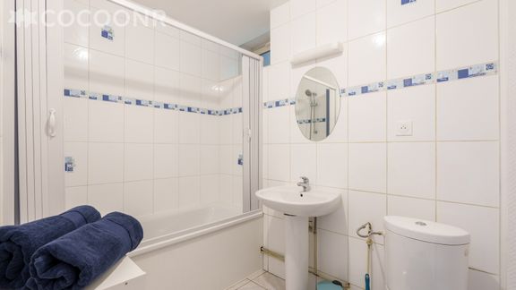 - Une salle de bain avec baignoire et WC