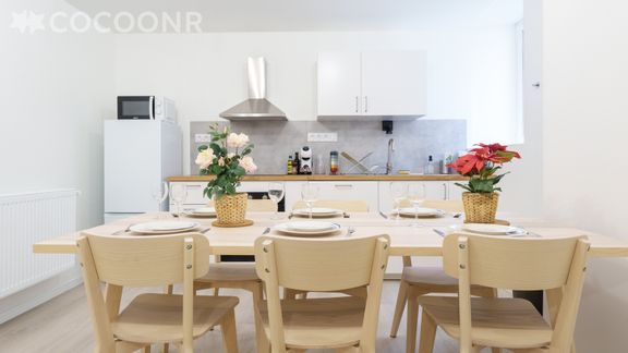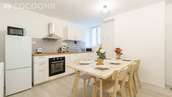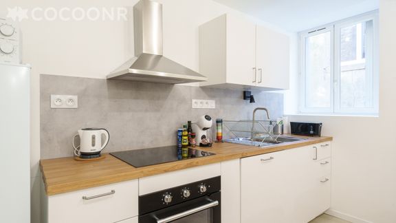 - Une cuisine équipée avec notamment : bouilloire électrique, four, four à micro-ondes, grille-pain, lave-vaisselle, plaques de cuisson... et son espace repas