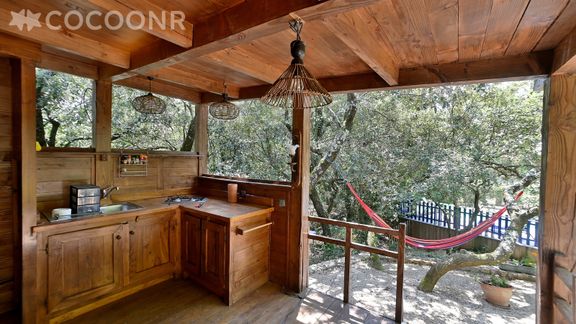- Une cuisiné d'été avec le nécessaire d’ustensiles de cuisine, tables, chaises, plancha électrique, feux de cuisson au gaz.