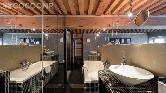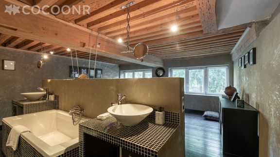 - Salle de bain ouverte avec double vasque, baignoire, douche et WC