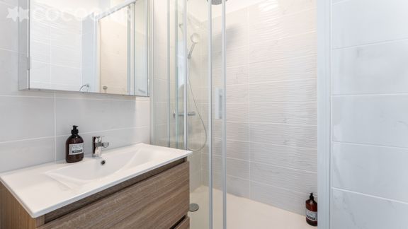 - Une douche avec ciel de pluie et douchette, une vasque, un sèche-serviette, un sèche-cheveux, une armoire avec miroir.