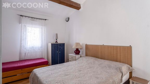 - Une chambre en mezzanine : Un lit queen-size (160×200), un lit simple et un placard