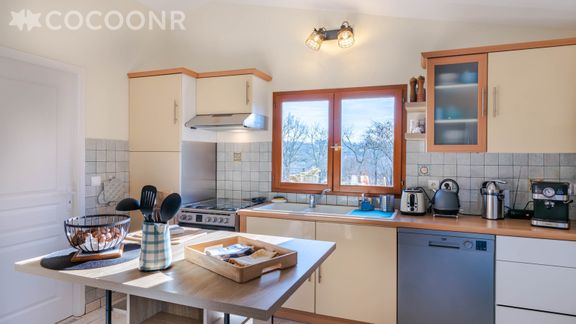 - Une cuisine équipée avec notamment : un mange debout, une bouilloire électrique, un four, un four à micro-ondes, un grille-pain, un lave-vaisselle, des plaques de cuisson...