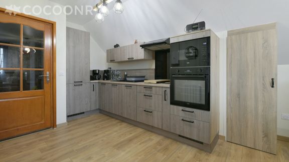 - Une cuisine ouverte équipée avec notamment : bouilloire électrique, four, four à micro-ondes, grille-pain, lave-vaisselle, plaques de cuisson...