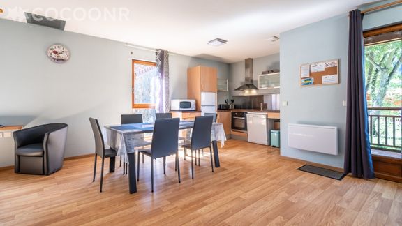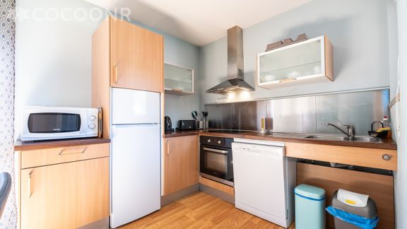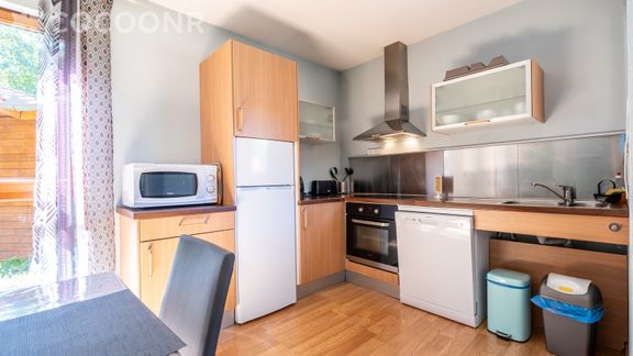 - Une cuisine équipée avec notamment : bouilloire électrique, four, four à micro-ondes, grille-pain, lave-vaisselle, plaques de cuisson...