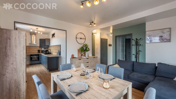- Une pièce de vie de 20 m² avec canapé-lit double, espace repas, TV