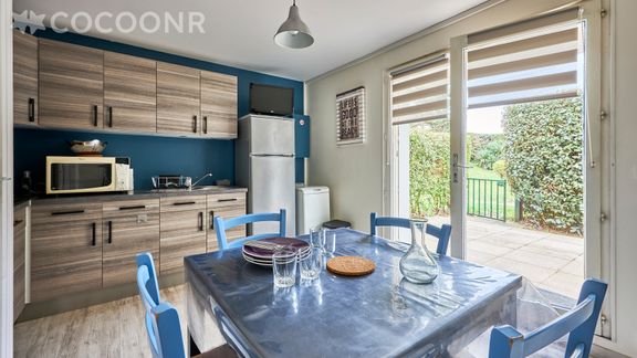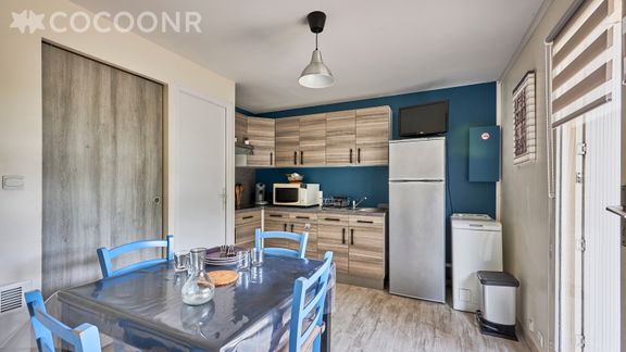 - Une cuisine ouverte équipée avec notamment : four, four à micro-ondes, grille-pain, Cafetière à dosettes Senseo, lave-vaisselle, plaques de cuisson...
