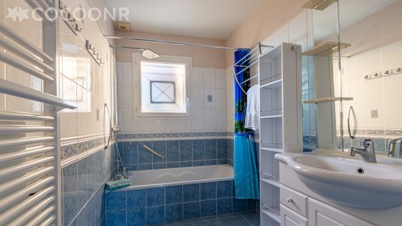 - Une salle de bain avec une baignoire, une vasque, un sèche-serviettes chauffant et un sèche-cheveux.