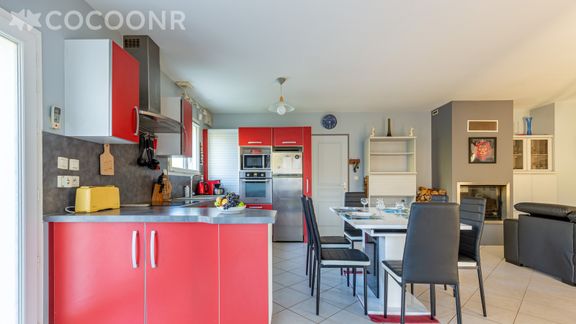- Une cuisine ouverte sur le salon et entièrement équipée : réfrigérateur, lave-vaisselle, congélateur, four, plaques à induction, micro-ondes, grille-pain, bouilloire, cafetière à dosettes Nespresso...