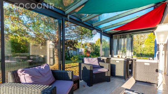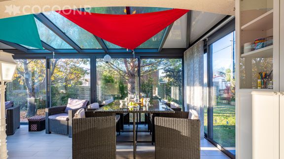 - Une véranda exposée sud et aménagée avec un salon de jardin et une grande table de réception.
