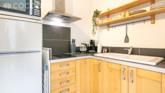 - Une cuisine équipée avec notamment : bouilloire électrique, four à micro-ondes, plaques de cuisson...