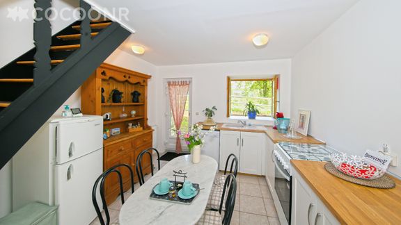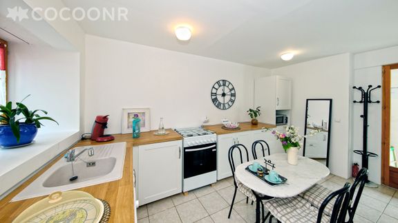 - Un espace repas et cuisine équipée avec notamment : bouilloire électrique, four, four à micro-ondes, grille-pain, lave-vaisselle, plaques de cuisson...