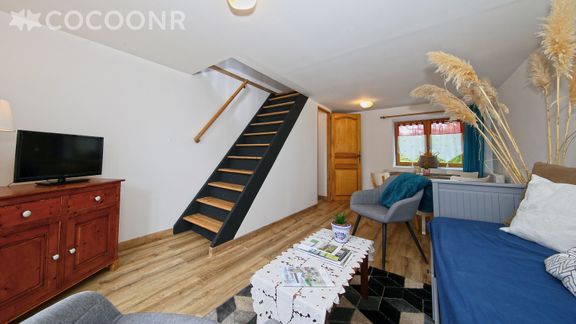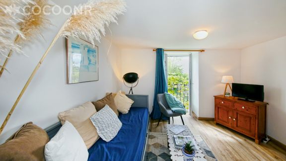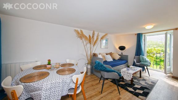 - Une pièce de vie de 19 m² avec un canapé-lit double, espace repas, TV...