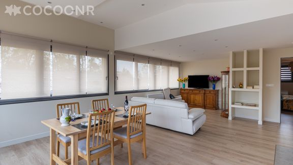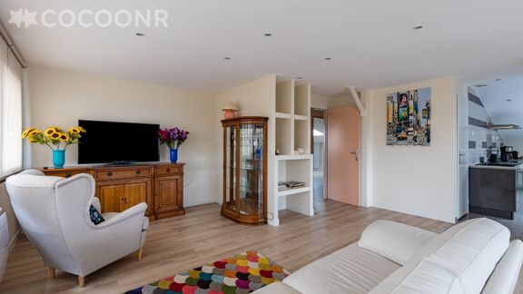 - Une pièce de vie de 50 m² avec TV, canapé, fauteuil et espace repas