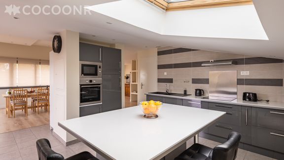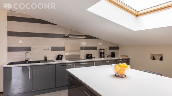 - Une cuisine ouverte équipée avec notamment : bouilloire électrique, four, four à micro-ondes, grille-pain, lave-vaisselle, plaques de cuisson, cafetière à dosettes Nespresso...