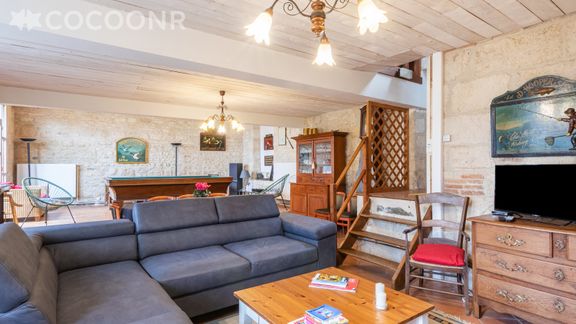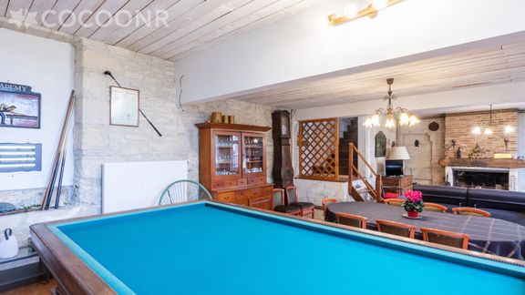 - une pièce de vie avec une TV, un poêle à bois (1ère flambée offerte, bois complémentaire en supplément), espace salle à manger et un billard.