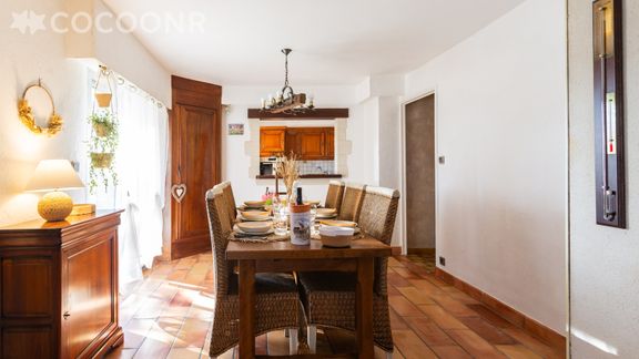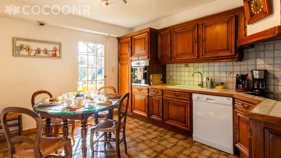 - Un coin repas chaleureux de 15 m² donnant sur une cuisine entièrement équipée avec notamment : bouilloire électrique, four, four à micro-ondes, grille-pain, lave-vaisselle, plaques de cuisson...