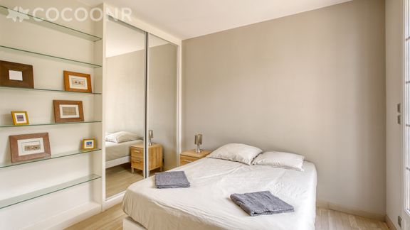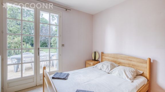 - Chambre 1 : suite parentale avec un lit double (140×190) et salle de bain attenante avec baignoire et WC