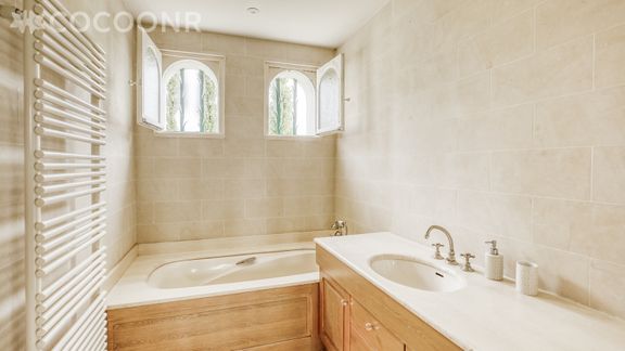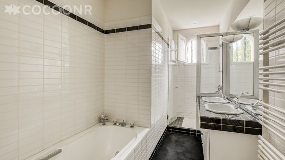 - Une salle de bain avec baignoire et douche à l'italienne, meuble vasque, sèche-serviettes