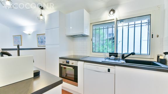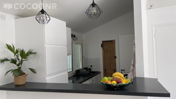 - Une cuisine, ouverte sur le séjour, équipée avec notamment : bouilloire électrique, four, four à micro-ondes, grille-pain, lave-vaisselle, plaques de cuisson...