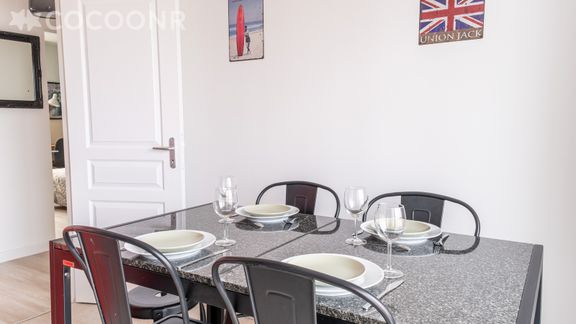 - Une cuisine équipée avec notamment : bouilloire électrique, four, four à micro-ondes, grille-pain, lave-vaisselle, plaques de cuisson... et un espace repas