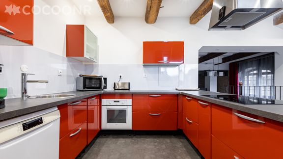 - Une cuisine moderne, ouverte sur la salle à manger et entièrement équipée : réfrigérateur, lave-vaisselle, congélateur, four, plaques à induction, micro-ondes, grille-pain, bouilloire, cafetière à dosettes Senseo..