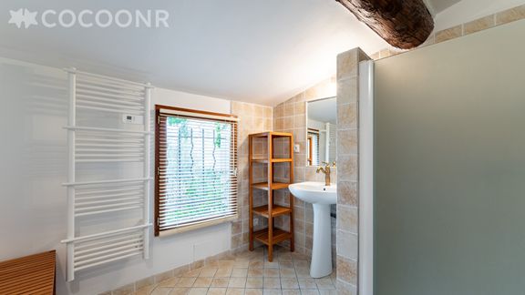 - Une salle d'eau avec une douche, une vasque, un sèche-serviettes chauffant et un sèche-cheveux.